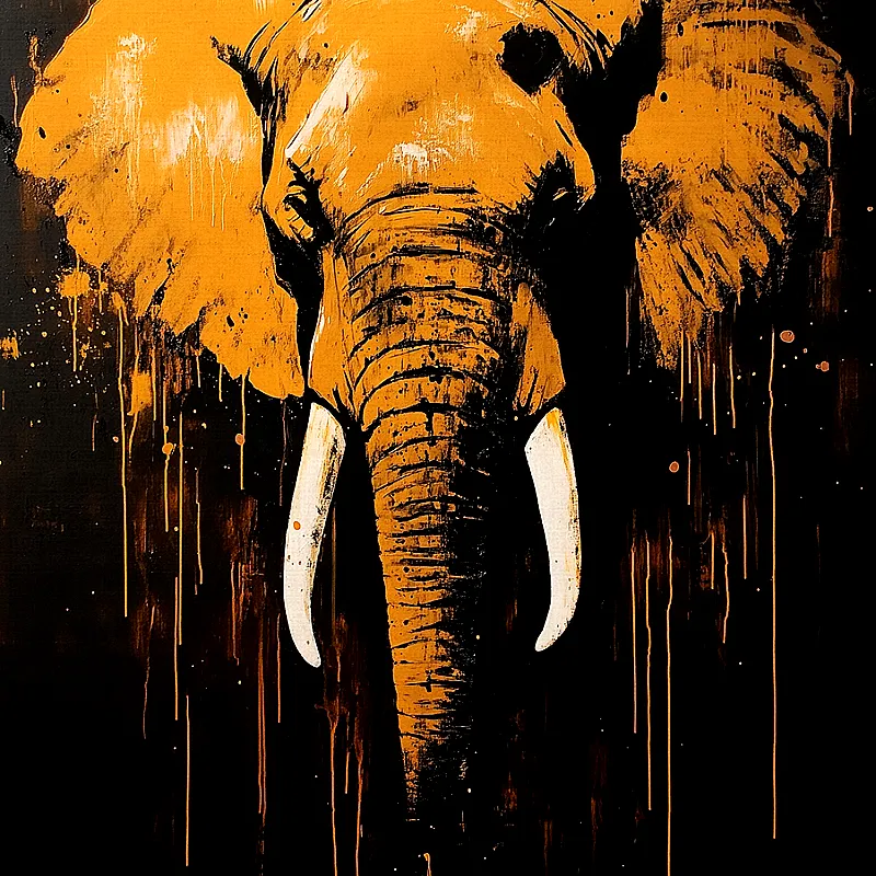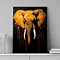 Slon naslikan snažnim narandžastim tonovima sa efektnim kapljicama boje na tamnoj pozadini. Moderan i hrabar umetnički izraz koji privlači pažnju.